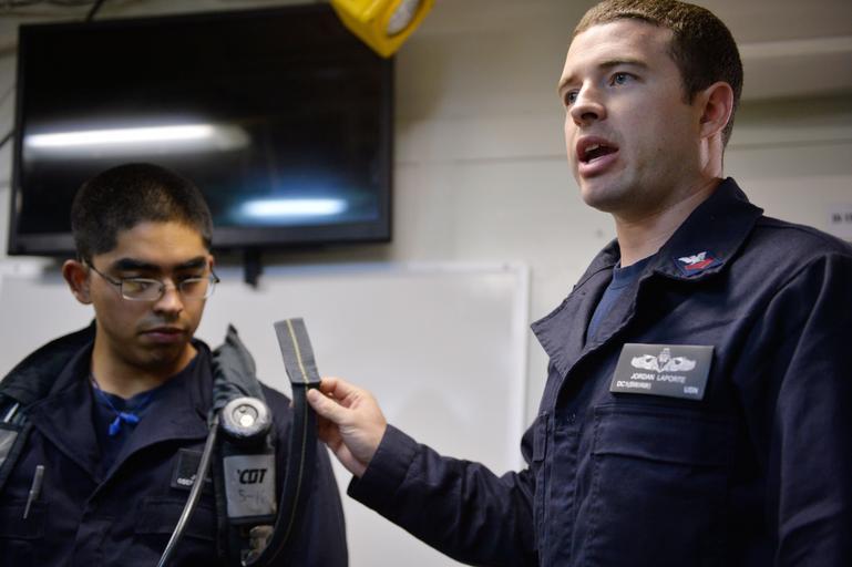 Keywords: u.s. navy usnavy uss ross (ddg 71) ussrossddg71 groupshot people indoor 151124-N-XT273-035 MEDITERRANEAN SEA (Nov. 24, 2015) Damage Controlman 1st Class Jordan LaPorte demonstrates the proper use of a Self-Contained Breathing Apparatus during egress training aboard USS Ross (DDG 71) Nov. 24, 2015. Ross, an Arleigh Burke-class guided-missile destroyer, forward deployed to Rota, Spain, is conducting naval operations in the U.S. 6th Fleet area of operations in support of U.S. national security interests in Europe. (U.S. Navy photo by Mass Communication Specialist 2nd Class Justin Stumberg/Released) 151124-N-XT273-035 MEDITERRANEAN SEA (Nov. 24, 2015) Damage Controlman 1st Class Jordan LaPorte demonstrates the proper use of a Self-Contained Breathing Apparatus during egress training aboard USS Ross (DDG 71) Nov. 24, 2015. Ross, an Arleigh Burke-class guided-missile destroyer, forward deployed to Rota, Spain, is conducting naval operations in the U.S. 6th Fleet area of operations in support of U.S. national security interests in Europe. (U.S. Navy photo by Mass Communication Specialist 2nd Class Justin Stumberg/Released) |
