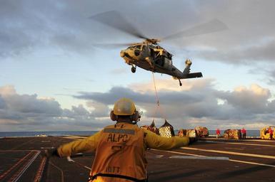 | Keywords: abh1 arias abh1arias hsc 7 hsc7 cvn 69 cvn69 usns kanawha usnskanawha ras daily release dailyrelease mc3 jackson mc3jackson november 29 november29 uss dwight d. eisenhower ussdwightdeisenhower atlantic ocean atlanticocean outdoor 151129-N-FI568-031 . ATLANTIC OCEAN (Nov. 29, 2015) - Aviation Boatswain's Mate (Handling) 1st Class Manuel Arias signals to an MH-60S Sea Hawk helicopter assigned to the Dusty Dogs of Helicopter Sea Combat Squadron (HSC) 7 to lower its cargo onto the flight deck of the aircraft carrier USS Dwight D. Eisenhower (CVN 69) during a replenishment at sea with the Military Sealift Command fleet replenishment oiler USNS Kanawha (T-AO 196). Dwight D. Eisenhower, with embarked Carrier Air Wing 3, is underway conducting the Tailored Ship's Training Availability (TSTA) and Final Evaluation Problem (FEP) as part of the basic phase of the Optimized Fleet Response Plan. (U.S. Navy photo by Mass Communication Specialist 3rd Class Taylor L. Jackson/Released) 151129-N-FI568-031 . ATLANTIC OCEAN (Nov. 29, 2015) - Aviation Boatswain's Mate (Handling) 1st Class Manuel Arias signals to an MH-60S Sea Hawk helicopter assigned to the Dusty Dogs of Helicopter Sea Combat Squadron (HSC) 7 to lower its cargo onto the flight deck of the aircraft carrier USS Dwight D. Eisenhower (CVN 69) during a replenishment at sea with the Military Sealift Command fleet replenishment oiler USNS Kanawha (T-AO 196). Dwight D. Eisenhower, with embarked Carrier Air Wing 3, is underway conducting the Tailored Ship's Training Availability (TSTA) and Final Evaluation Problem (FEP) as part of the basic phase of the Optimized Fleet Response Plan. (U.S. Navy photo by Mass Communication Specialist 3rd Class Taylor L. Jackson/Released) |