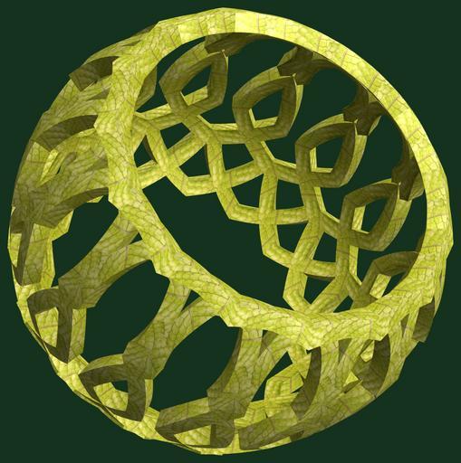 | Keywords: mathematica 3d cg parametricplot3d texture torus code program algorithm プログラム コード アルゴリズム 輪環 りんかん ドーナツ どーなつ 五芒星 ごぼうせい geometric sculpture geometricsculpture shape geometry sculpture mapping テクスチャ マッピング 模様 もよう abstract 抽象 ちゅうしょう アブストラクト design pattern デザイン パターン graphic グラフィック グラフィクス structure 意匠 構造 symmetry 対称性 たいしょうせい シンメトリー 対称 たいしょう organic pattern round circle wheel ancient a = 10; (* center hole size *) b = 5; (* penta-torus *) c = -22; (* distance from the center of rotation *) d = 15; (* number of torus *) h = 1; (* height of a torus *) SetOptions[ParametricPlot3D, PlotRange -> Full, Mesh -> None, Boxed -> False, Axes -> False, PlotPoints -> 250, ImageSize -> 2400, Background -> RGBColor[{20, 50, 30}/255], PlotStyle -> Directive[Specularity[White, 30], Texture[Import["D:/tmp/71.jpg"]]], TextureCoordinateFunction -> ({#4, #5 Pi} &), Lighting -> "Neutral"]; f[v_] := TriangleWave[{-1, 1}, v/(2 Pi)]; g[v_] := TriangleWave[{-1, 1}, v/(2 Pi) + 1/4]; x = (a - g[t] - f[b s]) Cos[s + 3 Pi/(4 b)]; y = (a - g[t] - f[b s]) Sin[s + 3 Pi/(4 b)]; z = (a - f[t] - h f[b s]) + c; rm = Table[{x, y, z}.RotationMatrix[2 i Pi/d, {1, 1, 0}], {i, d}]; ParametricPlot3D[rm, {t, 0, 2 Pi}, {s, 0, Pi}] (*--- The Texture *) a = 10; (* center hole size *) b = 5; (* penta-torus *) c = -22; (* distance from the center of rotation *) d = 15; (* number of torus *) h = 1; (* height of a torus *) SetOptions[ParametricPlot3D, PlotRange -> Full, Mesh -> None, Boxed -> False, Axes -> False, PlotPoints -> 250, ImageSize -> 2400, Background -> RGBColor[{20, 50, 30}/255], PlotStyle -> Directive[Specularity[White, 30], Texture[Import["D:/tmp/71.jpg"]]], TextureCoordinateFunction -> ({#4, #5 Pi} &), Lighting -> "Neutral"]; f[v_] := TriangleWave[{-1, 1}, v/(2 Pi)]; g[v_] := TriangleWave[{-1, 1}, v/(2 Pi) + 1/4]; x = (a - g[t] - f[b s]) Cos[s + 3 Pi/(4 b)]; y = (a - g[t] - f[b s]) Sin[s + 3 Pi/(4 b)]; z = (a - f[t] - h f[b s]) + c; rm = Table[{x, y, z}.RotationMatrix[2 i Pi/d, {1, 1, 0}], {i, d}]; ParametricPlot3D[rm, {t, 0, 2 Pi}, {s, 0, Pi}] (*--- The Texture *) |