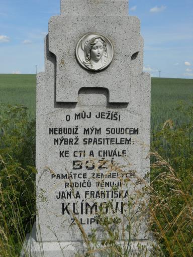 | Keywords: 15. kříž u Lipňan02.JPG cs Jedná se o betonový teracový kříž Stojí u cesty směrem na Rouchovany od Lipňan O MŮJ JEŽÍŠI NEBUDIŽ M M SOUDCEM N BRŽ SPASITELEM KE CTI A CHVÁLE BOŽÍ PAMÁTCE ZEMŘEL CH RODIČŮ VĚNUJÍ JAN A FRANTIŠKA KLÍMOVI Z LIPŇAN own Obecdukovany 1930 Crosses in Vysočina Region Dukovany |