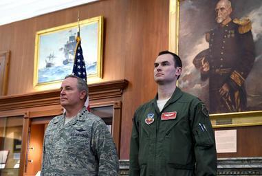 Keywords: 160201-N-ZD845-085 NEWPORT, R.I. (Feb. 1, 2016) Gen. Mark Welsh III, Air Force chief of staff, and Air Force Maj. Chris Marslender, U.S. Naval War College (NWC) student, stand at attention during the reading of an award citation at NWC, Feb. 1. Welsh, who addressed NWC students, faculty and staff earlier in the day, presented Marslender with the Distinguished Flying Cross for showing exemplary knowledge and outstanding airmanship under hazardous conditions. (U.S. Navy photo by Daniel S. Marciniak/Released) 160201-N-ZD845-085 NEWPORT, R.I. (Feb. 1, 2016) Gen. Mark Welsh III, Air Force chief of staff, and Air Force Maj. Chris Marslender, U.S. Naval War College (NWC) student, stand at attention during the reading of an award citation at NWC, Feb. 1. Welsh, who addressed NWC students, faculty and staff earlier in the day, presented Marslender with the Distinguished Flying Cross for showing exemplary knowledge and outstanding airmanship under hazardous conditions. (U.S. Navy photo by Daniel S. Marciniak/Released) |