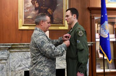 Keywords: 160201-N-ZD845-094 NEWPORT, R.I. (Feb. 1, 2016) Gen. Mark Welsh III, Air Force chief of staff, pins on the Distinguished Flying Cross to Air Force Maj. Chris Marslender, U.S. Naval War College (NWC) student, during an award ceremony at NWC, Feb. 1. Welsh, who addressed NWC students, faculty and staff earlier in the day, presented Marslender with the award for showing exemplary knowledge and outstanding airmanship under hazardous conditions. (U.S. Navy photo by Daniel S. Marciniak/Released) 160201-N-ZD845-094 NEWPORT, R.I. (Feb. 1, 2016) Gen. Mark Welsh III, Air Force chief of staff, pins on the Distinguished Flying Cross to Air Force Maj. Chris Marslender, U.S. Naval War College (NWC) student, during an award ceremony at NWC, Feb. 1. Welsh, who addressed NWC students, faculty and staff earlier in the day, presented Marslender with the award for showing exemplary knowledge and outstanding airmanship under hazardous conditions. (U.S. Navy photo by Daniel S. Marciniak/Released) |
