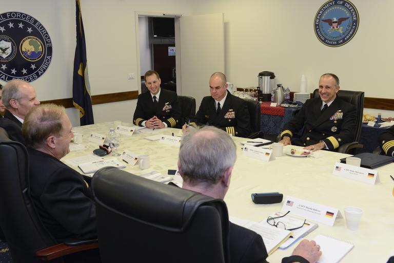 | Keywords: indoor 160209-N-UE250-007 NAPLES Italy (Feb. 9, 2016) U.S. Naval Forces Europe-Africa Chief of Staff, Rear Adm. Cathal O’Conner, top-right, hosts Head of Plans and Policy Directorate, German navy Rear Adm. Jürgen Mannhardt, bottom-left, along with other members of the German navy during staff talks on Naval Support Activity Naples, Capodichino Feb. 9, 2016. U.S. Naval Forces Europe-Africa, headquartered in Naples, Italy, oversees joint and naval operations, often in concert with allied, joint, and interagency partners, in order to advance U.S. national interests, security and stability in Europe and Africa. (U.S. Navy photo by Mass Communication Specialist 2nd Class Corey Hensley/Released) 160209-N-UE250-007 NAPLES Italy (Feb. 9, 2016) U.S. Naval Forces Europe-Africa Chief of Staff, Rear Adm. Cathal O’Conner, top-right, hosts Head of Plans and Policy Directorate, German navy Rear Adm. Jürgen Mannhardt, bottom-left, along with other members of the German navy during staff talks on Naval Support Activity Naples, Capodichino Feb. 9, 2016. U.S. Naval Forces Europe-Africa, headquartered in Naples, Italy, oversees joint and naval operations, often in concert with allied, joint, and interagency partners, in order to advance U.S. national interests, security and stability in Europe and Africa. (U.S. Navy photo by Mass Communication Specialist 2nd Class Corey Hensley/Released) |