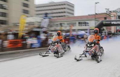 Keywords: 2016 iron dog 2016irondog alaska national guard alaskanationalguard snowmobile anchorage alaska usa us vehicle bike sport motorcycle Snowmobile racers leave the starting line during the opening ceremony for the 2016 Iron Dog race in Anchorage, Alaska, Feb. 20. This year 41 two-man teams are competing in the over 2,000 mile long race that stretches from Big Lake to Nome, and finishes in Fairbanks. The racers must traverse some of Alaska’s most remote and rugged terrain while confronting harsh winter conditions. (U.S. Air Force photo/Alejandro Peña) Snowmobile racers leave the starting line during the opening ceremony for the 2016 Iron Dog race in Anchorage, Alaska, Feb. 20. This year 41 two-man teams are competing in the over 2,000 mile long race that stretches from Big Lake to Nome, and finishes in Fairbanks. The racers must traverse some of Alaska’s most remote and rugged terrain while confronting harsh winter conditions. (U.S. Air Force photo/Alejandro Peña) |
