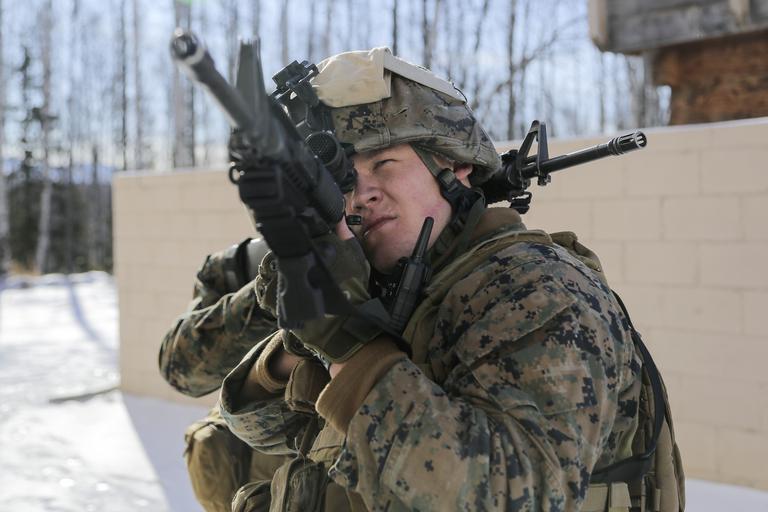 Keywords: 4th law enforcement battalion 4thlawenforcementbattalion mout military operation on urban terrain militaryoperationonurbanterrain military police militarypolice joint base elmendorf-richardson jointbaseelmendorfrichardson alaska usa us people U.S. Marine Corps Cpl. Joseph Myers, assigned to Detachment Military Police Company D, 4th Law Enforcement Battalion, holds a security position while assaulting Baumeister City military operations on urban terrain (MOUT) complex at Joint Base Elmendorf-Richardson, Alaska, March 6, 2016. The MOUT training prepared the Marines for their upcoming deployment to Serbia where they will serve as military police advisors. (U.S. Air Force photo/Alejandro Peña) U.S. Marine Corps Cpl. Joseph Myers, assigned to Detachment Military Police Company D, 4th Law Enforcement Battalion, holds a security position while assaulting Baumeister City military operations on urban terrain (MOUT) complex at Joint Base Elmendorf-Richardson, Alaska, March 6, 2016. The MOUT training prepared the Marines for their upcoming deployment to Serbia where they will serve as military police advisors. (U.S. Air Force photo/Alejandro Peña) |