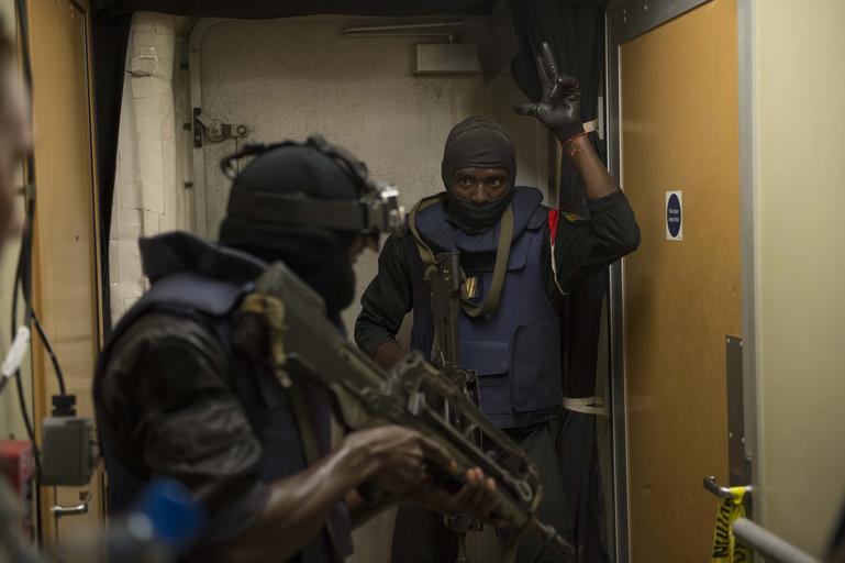 Keywords: africa partnership station; africa partnership station 2016; aps africapartnershipstationafricapartnershipstation2016aps obangame_saharan express 2016 obangamesaharanexpress2016 usns spearhead (t-epf 1) usnsspearheadtepf1 africa partnership station; africa partnership station 2016; aps16; aps; c6f; usns; spearhead; navy; partnership; military sealift command; u.s. navy; navy; africapartnershipstationafricapartnershipstation2016aps16apsc6fusnsspearheadnavypartnershipmilitarysealiftcommandusnavynavy indoor 160319-N-WV703-271 GULF OF GUINEA (March 19, 2016) - Gendarmerie members conduct an initial sweep during a boarding exercise aboard USNS Spearhead (T-EPF 1) March 19, as part of Exercise Obangame/Saharan Express 2016.. Obangame/Saharan Express one of three African regional express series exercises facilitated by U.S. Naval Forces Europe-Africa/U.S. 6th Fleet, seeks to increase regional cooperation, maritime domain awareness, information sharing practices and improve interoperability among participating forces in order to enhance maritime security and regional economic stability. (U.S. Navy photo by Mass Communication Specialist 3rd Class Amy M. Ressler/Released) 160319-N-WV703-271 GULF OF GUINEA (March 19, 2016) - Gendarmerie members conduct an initial sweep during a boarding exercise aboard USNS Spearhead (T-EPF 1) March 19, as part of Exercise Obangame/Saharan Express 2016.. Obangame/Saharan Express one of three African regional express series exercises facilitated by U.S. Naval Forces Europe-Africa/U.S. 6th Fleet, seeks to increase regional cooperation, maritime domain awareness, information sharing practices and improve interoperability among participating forces in order to enhance maritime security and regional economic stability. (U.S. Navy photo by Mass Communication Specialist 3rd Class Amy M. Ressler/Released) |