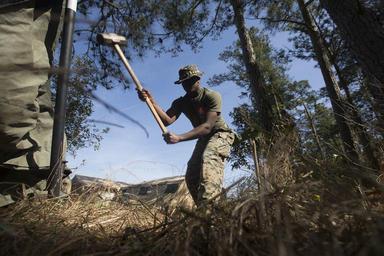 MAKE A MEME View Large Image Alexander Desir, an administrative specialist with the 24th Marine Expeditionary Unit (MEU), hammers a tent stake into the ground during the set up of the MEU's communications exercise (COMMEX) at Camp Lejeune, N.C., March 29, 2016. The ...