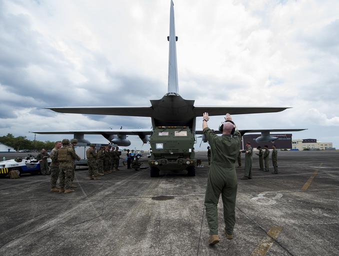 Keywords: afp asian pacific asianpacific balikatan bk16 marine corps marinecorps marines pacific marine pacificmarine pacific rebalance pacificrebalance shoulder to shoulder shouldertoshoulder us air force usairforce usarmy usnavy usphl clark air base clarkairbase philippines ph outdoor U.S. Marine Corps Staff Sgt. Bill Fenton guides the members of Fox Platoon, 2nd Battalion, 14th Marine Regiment as they load a M142 High Mobility Rocket Artillery System onto a KC-130J Super Hercules aircraft during Balikatan 16 (BK16) at Clark Air Base, Philippines, April 6, 2016. BK16 was an annual bilateral training exercise between the Armed Forces of the U.S. and Philippines forces intended to promote cooperation and contribute to regional stability and security. (U.S. Air Force photo by Tech. Sgt. Araceli Alarcon) U.S. Marine Corps Staff Sgt. Bill Fenton guides the members of Fox Platoon, 2nd Battalion, 14th Marine Regiment as they load a M142 High Mobility Rocket Artillery System onto a KC-130J Super Hercules aircraft during Balikatan 16 (BK16) at Clark Air Base, Philippines, April 6, 2016. BK16 was an annual bilateral training exercise between the Armed Forces of the U.S. and Philippines forces intended to promote cooperation and contribute to regional stability and security. (U.S. Air Force photo by Tech. Sgt. Araceli Alarcon)
