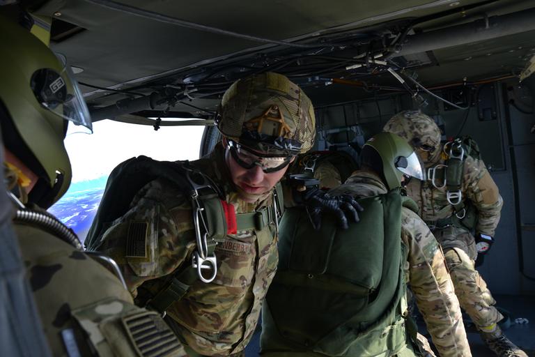 Keywords: joint base elmendorf-richardson jointbaseelmendorfrichardson alaska usa Airmen and Soldiers perform static and free-fall parachute jumps out of UH-60 Black Hawk helicopters as part of Grizzly Breakup, a training exercise, at Malemute drop zone, Joint Base Elmendorf-Richardson, Alaska, April 18, 2016. Grizzly Breakup is a week-long operation where service members from seven special operations units, spanning multiple installations, participate in parachute jumps out of Black Hawks and C-17 Globemaster IIIs. Airmen and Soldiers perform static and free-fall parachute jumps out of UH-60 Black Hawk helicopters as part of Grizzly Breakup, a training exercise, at Malemute drop zone, Joint Base Elmendorf-Richardson, Alaska, April 18, 2016. Grizzly Breakup is a week-long operation where service members from seven special operations units, spanning multiple installations, participate in parachute jumps out of Black Hawks and C-17 Globemaster IIIs.