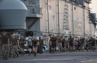 Keywords: 160528-N-KR961-028 160528-N-KR961-028.jpg en 160528-N-KR961-028 GULF OF ADEN May 28 2016 Sailors and Marines aboard amphibious assault ship USS Boxer LHD 4 participate in a Memorial Day sunrise ruck march on the flight deck Boxer is the flagship for the Boxer Amphibious Ready Group and with the embarked 13th Marine Expeditionary Unit is deployed in support of maritime security operations and theater security cooperation efforts in the U S 5th Fleet area of operations U S Navy photo by Mass Communication Specialist 2nd Class Debra Daco/Released Unit Navy Media Content Services DVIDS Tags Ruck March; USS Boxer LHD 4 ; Amphibious Ready Group; U S Navy; 13th MEU; 13th Marine Expeditionary Unit; NMCS; CPR-1; DVIDS Bulk Import; BOXARG13MEU16; Memorial Observance 2016-05-28 Petty Officer 2nd Class Debra Daco https //www dvidshub net/image/2626345/160528-n-kr961-028 160528-N-KR961-028 2016-06-01 00 02 GULF OF ADEN PD-USGov-Military-Navy 13th Marine Expeditionary Unit USS Boxer LHD-4 Images from DoD uploaded by Fæ |
