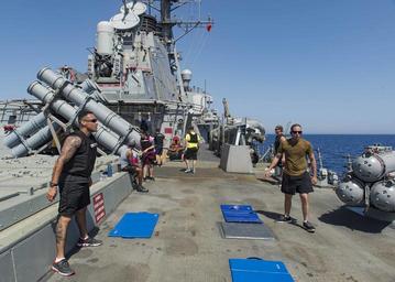 | Keywords: 160530-N-GP524-117 160530-N-GP524-117.jpg en 160530-N-GP524-117 MEDITERRANEAN SEA May 30 2016 Sailors assigned to USS Stout DDG 55 participate in the Memorial Day MURPH Challenge honoring the fallen Lt Michael Murphy through physical fitness while transiting the Mediterranean Sea May 30 2016 Stout an Arleigh Burke-class guided-missile destroyer deployed as part of the Eisenhower Carrier Strike Group is conducting naval operations in the U S 6th Fleet area of operations in support of U S national security interests in Europe U S Navy photo by Mass Communication Specialist 3rd Class Bill Dodge/Released Unit Navy Media Content Services DVIDS Tags 6th Fleet; Navy; Sailor; U S Navy; 5th Fleet; deployment; NMCS; DVIDS Bulk Import; USS S 2016-05-30 Petty Officer 3rd Class William Dodge https //www dvidshub net/image/2631521/160530-n-gp524-117 160530-N-GP524-117 2016-06-03 00 02 ATLANTIC OCEAN PD-USGov-Military-Navy USS Stout DDG-55 Images from DoD uploaded by Fæ |