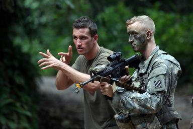 Keywords: 3/7in 37in 3rd id 3rdid army training usa gabon ga people outdoor A French soldier teaches squad movement drills to a U.S. Soldier assigned to Bravo Company, 3rd Battalion, 7th Infantry Regiment, 2nd Infantry Brigade Combat Team, 3rd Infantry Division, at the Jungle Warfare School in Gabon, June 8, 2016. Soldiers attended the French Jungle Warfare School as part of U.S. Army Africa's exercise Central Accord 2016, an annual, combined, joint military exercise that brings together partner nations to practice and demonstrate proficiency in conducting peacekeeping operation. (U.S. Army photo by Sgt Henrique Luiz de Holleben) A French soldier teaches squad movement drills to a U.S. Soldier assigned to Bravo Company, 3rd Battalion, 7th Infantry Regiment, 2nd Infantry Brigade Combat Team, 3rd Infantry Division, at the Jungle Warfare School in Gabon, June 8, 2016. Soldiers attended the French Jungle Warfare School as part of U.S. Army Africa's exercise Central Accord 2016, an annual, combined, joint military exercise that brings together partner nations to practice and demonstrate proficiency in conducting peacekeeping operation. (U.S. Army photo by Sgt Henrique Luiz de Holleben) |