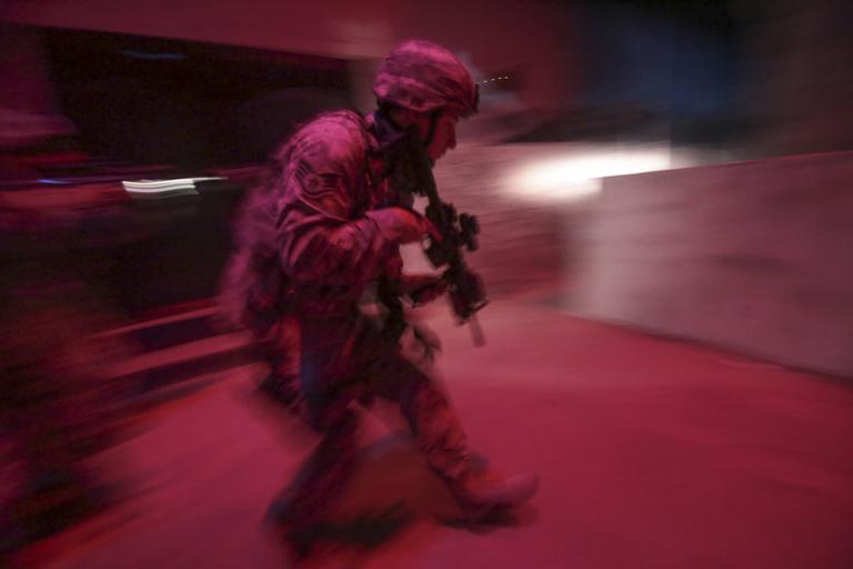 | Keywords: usaf u.s. air force usairforce air national guard airnationalguard new jersey newjersey 177th security forces squadron 177thsecurityforcessquadron m4 training joint base mcguire-dix-lakehurst jointbasemcguiredixlakehurst jt2dc n.j. nj usa public domain publicdomain free U.S. Air Force Staff Sgt. Christopher Raine maneuvers through an indoor Military Operations in Urban Terrain (MOUT) site at the New Jersey National Guard's Joint Training & Training Development Center (JT2DC), Joint Base McGuire-Dix-Lakehurst, N.J., June 16, 2016. Raine is a Security Forces specialist assigned to the New Jersey Air National Guard's 177th Security Forces Squadron. The 177th Security Forces Squadron was utilizing the ability for the JT2DC's training areas to simulate low-light conditions in an urban environment. The red and blue lighting simulates a moonlit night as seen through night vision devices. (U.S. Air National Guard photo by Tech. Sgt. Matt Hecht/Released) U.S. Air Force Staff Sgt. Christopher Raine maneuvers through an indoor Military Operations in Urban Terrain (MOUT) site at the New Jersey National Guard's Joint Training & Training Development Center (JT2DC), Joint Base McGuire-Dix-Lakehurst, N.J., June 16, 2016. Raine is a Security Forces specialist assigned to the New Jersey Air National Guard's 177th Security Forces Squadron. The 177th Security Forces Squadron was utilizing the ability for the JT2DC's training areas to simulate low-light conditions in an urban environment. The red and blue lighting simulates a moonlit night as seen through night vision devices. (U.S. Air National Guard photo by Tech. Sgt. Matt Hecht/Released) |