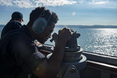 | Keywords: mass communication specialist 3rd class masscommunicationspecialist3rdclass mc3 casey j. hopkins caseyjhopkins norfolk deployment uss nitze ussnitze ddg 94 ddg94 atlantic ocean atlanticocean navy carrier strike group 10 carrierstrikegroup10 uss dwight d. eisenhower ussdwightdeisenhower destroyer forward deployed forwarddeployed cmdr. paul kaylor cmdrpaulkaylor mooring lines mooringlines heave pier military sealift command militarysealiftcommand ike csg ikecsg eisenhower carrier strike group eisenhowercarrierstrikegroup 5th fleet 5thfleet 6th fleet 6thfleet cvn 69 cvn69 carrier air wing 3 carrierairwing3 cvw 3 cvw3 destroyer squadron 26 destroyersquadron26 desron 26 desron26 uss san jacento usssanjacento cg 56 cg56 uss monterey ussmonterey cg 61 cg61 uss stout ussstout ddg 55 ddg55 uss roosevelt ussroosevelt ddg 80 ddg80 uss mason ussmason ddg 87 ddg87 arleigh burke-class guided-missile destroyer arleighburkeclassguidedmissiledestroyer hsm 74 hsm74 helicopter maritime strike squadron 74 helicoptermaritimestrikesquadron74 mh-60r sea hawk mh60rseahawk mediterranean sea mediterraneansea trieste italy qmsn quartermaster seaman quartermasterseaman cameron bullock cameronbullock telescopic alidade telescopicalidade outdoor 160618-N-EO381-039 MEDITERRANEAN SEA (June 18, 2016) - Quartermaster Seaman Cameron Bullock, assigned to the guided-missile destroyer USS Nitze (DDG 94), looks through a telescopic alidade as the ship arrives for a port visit in Trieste, Italy. Nitze, deployed as part of the Eisenhower Carrier Strike Group, is conducting naval operations in the U.S. 6th Fleet area of operations in support of U.S. national security interests in Europe. (U.S. Navy photo by Mass Communication Specialist 3rd Class Casey J. Hopkins/Released) 160618-N-EO381-039 MEDITERRANEAN SEA (June 18, 2016) - Quartermaster Seaman Cameron Bullock, assigned to the guided-missile destroyer USS Nitze (DDG 94), looks through a telescopic alidade as the ship arrives for a port visit in Trieste, Italy. Nitze, deployed as part of the Eisenhower Carrier Strike Group, is conducting naval operations in the U.S. 6th Fleet area of operations in support of U.S. national security interests in Europe. (U.S. Navy photo by Mass Communication Specialist 3rd Class Casey J. Hopkins/Released) |
