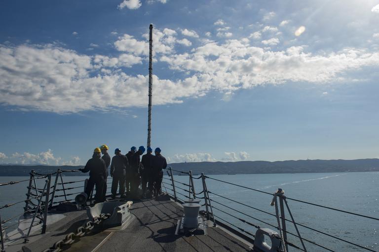 | Keywords: mass communication specialist 3rd class masscommunicationspecialist3rdclass mc3 casey j. hopkins caseyjhopkins norfolk deployment uss nitze ussnitze ddg 94 ddg94 atlantic ocean atlanticocean navy carrier strike group 10 carrierstrikegroup10 uss dwight d. eisenhower ussdwightdeisenhower destroyer forward deployed forwarddeployed cmdr. paul kaylor cmdrpaulkaylor mooring lines mooringlines heave pier military sealift command militarysealiftcommand ike csg ikecsg eisenhower carrier strike group eisenhowercarrierstrikegroup 5th fleet 5thfleet 6th fleet 6thfleet cvn 69 cvn69 carrier air wing 3 carrierairwing3 cvw 3 cvw3 destroyer squadron 26 destroyersquadron26 desron 26 desron26 uss san jacento usssanjacento cg 56 cg56 uss monterey ussmonterey cg 61 cg61 uss stout ussstout ddg 55 ddg55 uss roosevelt ussroosevelt ddg 80 ddg80 uss mason ussmason ddg 87 ddg87 arleigh burke-class guided-missile destroyer arleighburkeclassguidedmissiledestroyer hsm 74 hsm74 helicopter maritime strike squadron 74 helicoptermaritimestrikesquadron74 mh-60r sea hawk mh60rseahawk mediterranean sea mediterraneansea trieste italy jack staff jackstaff outdoor sky 160618-N-EO381-073 MEDITERRANEAN SEA (June 18, 2016) - Sailors assigned to the guided-missile destroyer USS Nitze (DDG 94), install the jack staff as the ship arrives for a port visit in Trieste, Italy. Nitze, deployed as part of the Eisenhower Carrier Strike Group, is conducting naval operations in the U.S. 6th Fleet area of operations in support of U.S. national security interests in Europe. (U.S. Navy photo by Mass Communication Specialist 3rd Class Casey J. Hopkins/Released) 160618-N-EO381-073 MEDITERRANEAN SEA (June 18, 2016) - Sailors assigned to the guided-missile destroyer USS Nitze (DDG 94), install the jack staff as the ship arrives for a port visit in Trieste, Italy. Nitze, deployed as part of the Eisenhower Carrier Strike Group, is conducting naval operations in the U.S. 6th Fleet area of operations in support of U.S. national security interests in Europe. (U.S. Navy photo by Mass Communication Specialist 3rd Class Casey J. Hopkins/Released) |
