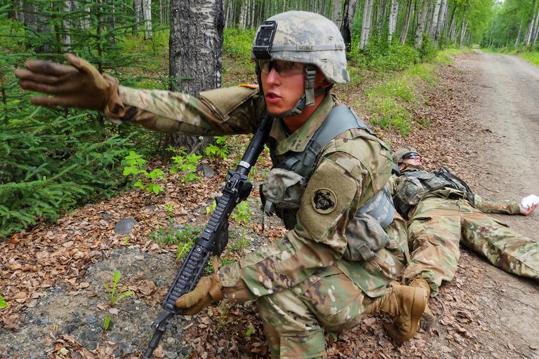 | Keywords: soldiers; army; u.s. army; u.s. army alaska; usarpac; u.s. army soldiersarmyusarmyusarmyalaskausarpacusarmy joint base elmendorf-richardson jointbaseelmendorfrichardson alaska usa soldiers; army; u.s. army; u.s. army alaska; usarpac; u.s. army pacific; ready warrior; competition; small unit; leadership; testing; training soldiersarmyusarmyusarmyalaskausarpacusarmypacificreadywarriorcompetitionsmallunitleadershiptestingtraining outdoor Spc. Colton Gobel, a native of Touchet, Wash., assigned to the 539th Composite Truck Company (Light), 17th Combat Sustainment Support Battalion, U.S. Army Alaska, yells an order for a fellow soldier to provide security before he tends to a simulated casualty behind him on a Situation Exercise Training lane during the Ready Warrior Competition at Camp Madbull on Joint Base Elmendorf-Richardson, Alaska, Thursday, June 23, 2016. The three-day competition tested teams of Soldiers in physical fitness, small arms proficiency, land navigation, and small-unit tactics as well as other Soldier skills. (U.S. Air Force photo/Justin Connaher) Spc. Colton Gobel, a native of Touchet, Wash., assigned to the 539th Composite Truck Company (Light), 17th Combat Sustainment Support Battalion, U.S. Army Alaska, yells an order for a fellow soldier to provide security before he tends to a simulated casualty behind him on a Situation Exercise Training lane during the Ready Warrior Competition at Camp Madbull on Joint Base Elmendorf-Richardson, Alaska, Thursday, June 23, 2016. The three-day competition tested teams of Soldiers in physical fitness, small arms proficiency, land navigation, and small-unit tactics as well as other Soldier skills. (U.S. Air Force photo/Justin Connaher) |