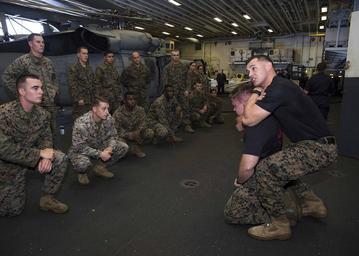 | Keywords: 22 meu 22meu amphibious ready group amphibiousreadygroup amphibious ready group/marine expeditionary unit amphibiousreadygroupmarineexpeditionaryunit lhd 1 lhd1 marines training u.s. marine corps usmarinecorps uss wasp usswasp chokehold combat skills combatskills hand-to-hand handtohand mediterranean sea mediterraneansea 160718-N-TO519-143 MEDITERRANEAN SEA (July 18, 2016) Staff Sgt. William Kelley, right, and Staff Sgt. Zebulon Enright teach Marines a choke hold aboard the amphibious assault ship USS Wasp (LHD 1) July 18, 2016. Wasp is deployed with the Wasp Amphibious Ready Group to support maritime security operations and theater security cooperation efforts in the U.S. 6th Fleet area of operations. (U.S. Navy photo by Mass Communication Specialist 2nd Class Nathan Wilkes/Released) 160718-N-TO519-143 MEDITERRANEAN SEA (July 18, 2016) Staff Sgt. William Kelley, right, and Staff Sgt. Zebulon Enright teach Marines a choke hold aboard the amphibious assault ship USS Wasp (LHD 1) July 18, 2016. Wasp is deployed with the Wasp Amphibious Ready Group to support maritime security operations and theater security cooperation efforts in the U.S. 6th Fleet area of operations. (U.S. Navy photo by Mass Communication Specialist 2nd Class Nathan Wilkes/Released) |