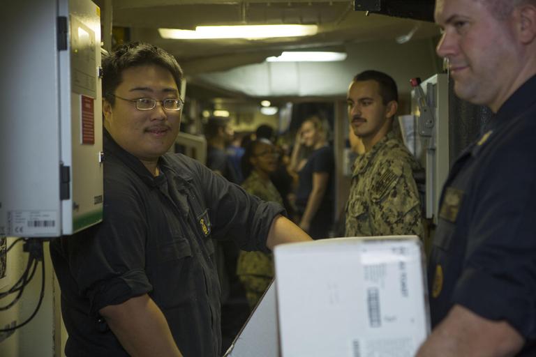 Keywords: usmc marine corps marinecorps marines combat camera combatcamera comcam exercise 22 meu 22meu meu marine expeditionary unit marineexpeditionaryunit ras resupply at sea resupplyatsea uss wasp (lhd-1) usswasplhd1 usa groupshot people indoor 160723-M-AF202-035 MEDITERRANEAN SEA (July 23, 2016) Marines and Sailors work together during a replenishment at sea aboard the amphibious assault ship USS Wasp (LHD-1) July 23, 2016. 22nd MEU, deployed with the Wasp Amphibious Ready Group, is conducting naval operations in the 6th Fleet area of operations in support of U.S. national security interests in Europe. (U.S. Marine Corps photo by Lance Cpl. Koby I. Saunders) 160723-M-AF202-035 MEDITERRANEAN SEA (July 23, 2016) Marines and Sailors work together during a replenishment at sea aboard the amphibious assault ship USS Wasp (LHD-1) July 23, 2016. 22nd MEU, deployed with the Wasp Amphibious Ready Group, is conducting naval operations in the 6th Fleet area of operations in support of U.S. national security interests in Europe. (U.S. Marine Corps photo by Lance Cpl. Koby I. Saunders) |