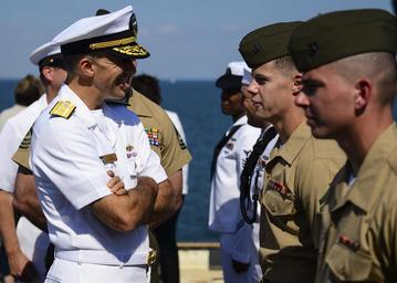 | Keywords: rear adm. cathal s. o'connor rearadmcathalsoconnor chief of staff u.s. naval forces europe-africa chiefofstaffusnavalforceseuropeafrica amphibious dock landing ship uss whidbey island lsd 41 amphibiousdocklandingshipusswhidbeyislandlsd41 odessa ukraine outdoor 160724-N-TI017-351 ODESSA, Ukraine (July 24, 2016) Rear Adm. Cathal S. O’Connor, chief of staff, U.S. Naval Forces Europe-Africa/U.S. 6th Fleet, speaks with Sailors and Marines on the flight deck of the amphibious dock landing ship USS Whidbey Island (LSD 41) July 24, 2016. Whidbey Island is participating in Exercise Sea Breeze 2016, an air, land and maritime exercise designed to improve maritime safety, security and stability in the Black Sea. (U.S. Navy photo by Mass Communication Specialist 2nd Class Nathan R. McDonald/Released) 160724-N-TI017-351 ODESSA, Ukraine (July 24, 2016) Rear Adm. Cathal S. O’Connor, chief of staff, U.S. Naval Forces Europe-Africa/U.S. 6th Fleet, speaks with Sailors and Marines on the flight deck of the amphibious dock landing ship USS Whidbey Island (LSD 41) July 24, 2016. Whidbey Island is participating in Exercise Sea Breeze 2016, an air, land and maritime exercise designed to improve maritime safety, security and stability in the Black Sea. (U.S. Navy photo by Mass Communication Specialist 2nd Class Nathan R. McDonald/Released) |