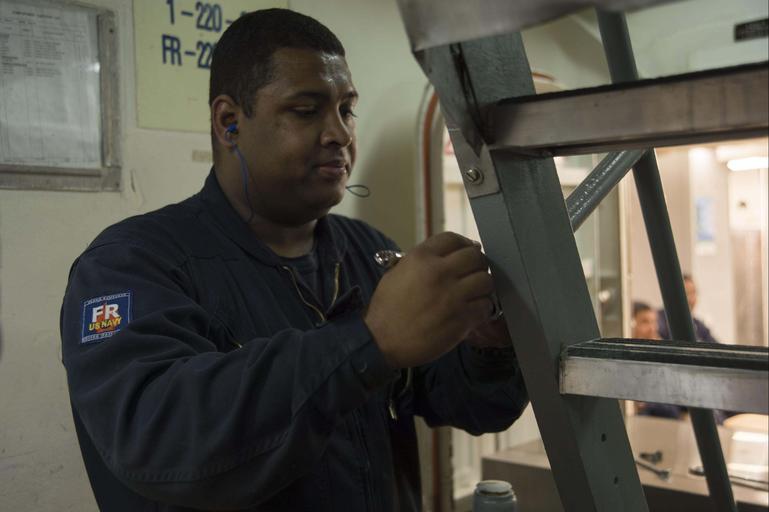 | Keywords: people 160816-N-ZE250-031 MEDITERRANEAN SEA (Aug. 16, 2016) - Machinist's Mate 1st Class Ericsson Soares removes a railing on a ladder in preparation to move a refrigeration unit aboard USS Carney (DDG 64) Aug. 16, 2016. Carney, an Arleigh Burke-class guided-missile destroyer, forward-deployed to Rota, Spain, is conducting a routine patrol in the U.S. 6th fleet area of operations in support of U.S. national security interests in Europe. (U.S. Navy photo by Mass Communication Specialist 3rd Class Weston Jones/Released) 160816-N-ZE250-031 MEDITERRANEAN SEA (Aug. 16, 2016) - Machinist's Mate 1st Class Ericsson Soares removes a railing on a ladder in preparation to move a refrigeration unit aboard USS Carney (DDG 64) Aug. 16, 2016. Carney, an Arleigh Burke-class guided-missile destroyer, forward-deployed to Rota, Spain, is conducting a routine patrol in the U.S. 6th fleet area of operations in support of U.S. national security interests in Europe. (U.S. Navy photo by Mass Communication Specialist 3rd Class Weston Jones/Released) |