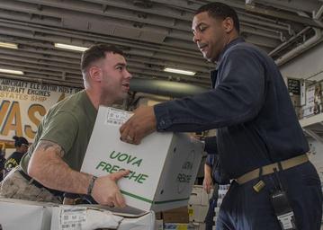 | Keywords: lhd1 uss wasp usswasp wasp arg wasparg usns big horn (t-ao 198) usnsbighorntao198 u.s. 6th fleet us6thfleet mediterranean sea mediterraneansea 160822-N-LG762-240 MEDITERRANEAN SEA (Aug. 22, 2016) Marine Staff Sgt. William Taylor and Chief Culinary Specialist John Carter stack boxes of eggs in the hangar bay aboard the amphibious assault ship USS Wasp (LHD 1) during a replenishment-at-sea Aug. 22, 2016. Wasp is deployed with the Wasp Amphibious Ready Group to support maritime security operations and theater security cooperation efforts in the U.S. 6th Fleet area of operations. (U.S. Navy photo by Mass Communication Specialist 3rd Class Zhiwei Tan/Released) 160822-N-LG762-240 MEDITERRANEAN SEA (Aug. 22, 2016) Marine Staff Sgt. William Taylor and Chief Culinary Specialist John Carter stack boxes of eggs in the hangar bay aboard the amphibious assault ship USS Wasp (LHD 1) during a replenishment-at-sea Aug. 22, 2016. Wasp is deployed with the Wasp Amphibious Ready Group to support maritime security operations and theater security cooperation efforts in the U.S. 6th Fleet area of operations. (U.S. Navy photo by Mass Communication Specialist 3rd Class Zhiwei Tan/Released) |