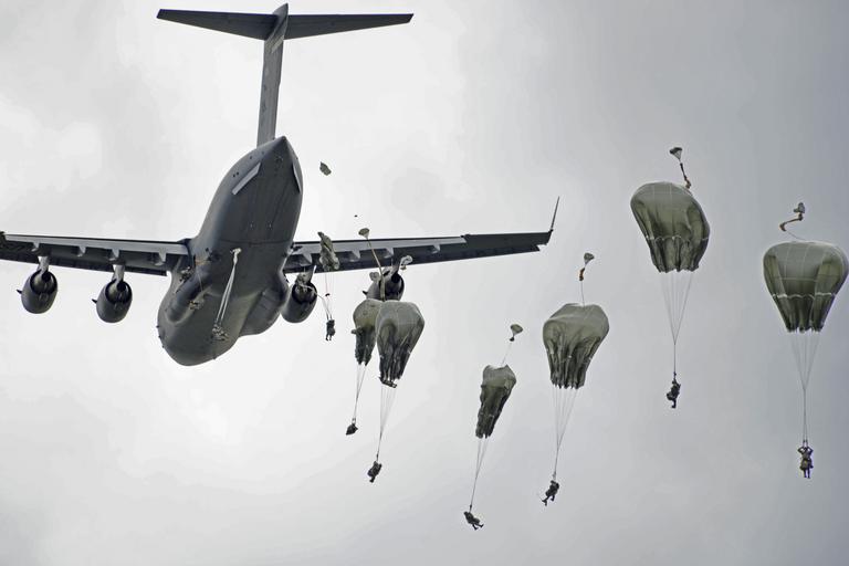 Keywords: Paratroopers assigned to the 4th Infantry Brigade Combat Team (Airborne), 25th Infantry Division, U.S. Army Alaska, jump from a C-17 Globemaster III during a joint forcible entry exercise at Malemute Drop Zone on Joint Base Elmendorf-Richardson, Alaska, Aug. 23, 2016, as part of Exercise Spartan Agoge. Spartan Agoge is a brigade-level field training exercise that began Aug. 15, and focuses on an array of combat-related tasks from squad live-fire exercises to helicopter air insertion and airborne assault training. (U.S. Air Force photo by Airman 1st Class Valerie Monroy) Paratroopers assigned to the 4th Infantry Brigade Combat Team (Airborne), 25th Infantry Division, U.S. Army Alaska, jump from a C-17 Globemaster III during a joint forcible entry exercise at Malemute Drop Zone on Joint Base Elmendorf-Richardson, Alaska, Aug. 23, 2016, as part of Exercise Spartan Agoge. Spartan Agoge is a brigade-level field training exercise that began Aug. 15, and focuses on an array of combat-related tasks from squad live-fire exercises to helicopter air insertion and airborne assault training. (U.S. Air Force photo by Airman 1st Class Valerie Monroy) |