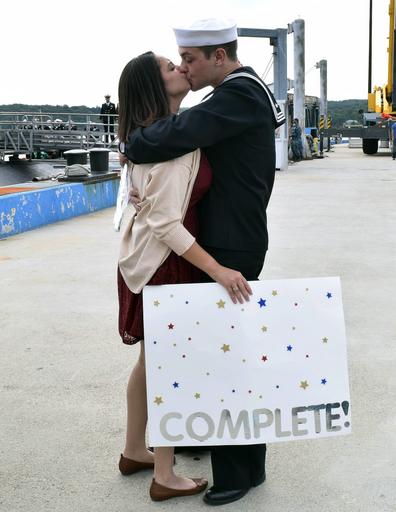 | Keywords: 160923-N-EC678-040 GROTON, Conn. (Sept. 23, 2016) Los Angeles class, nuclear-powered, fast-attack submarine USS San Juan (SSN-751) crewmember Seaman Apprentice Electronics Technician Christopher Ognissant and his wife Kassandra share the honorary first kiss upon San Juan’s return to homeport following a routine deployment to the EUCOM Area of Responsibility. (U.S. Navy Photo by Mass Communication Specialist Second Class Erin Hamilton/Released). 160923-N-EC678-040 GROTON, Conn. (Sept. 23, 2016) Los Angeles class, nuclear-powered, fast-attack submarine USS San Juan (SSN-751) crewmember Seaman Apprentice Electronics Technician Christopher Ognissant and his wife Kassandra share the honorary first kiss upon San Juan’s return to homeport following a routine deployment to the EUCOM Area of Responsibility. (U.S. Navy Photo by Mass Communication Specialist Second Class Erin Hamilton/Released). |
