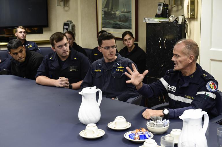 | Keywords: navy uss ross (ddg 71) ussrossddg71 ddg 71 ddg71 u.s. 6th fleet us6thfleet c6f ctf 65 ctf65 patrol mediterranean sea mediterraneansea rear adm. olivier lebas rearadmolivierlebas france indoor 160924-N-FP878-326 MEDITERRANEAN SEA (Sept. 24, 2016) French Rear Adm. Olivier Lebas speaks to officers aboard USS Ross (DDG 71) Sept. 24, 2016. Ross, an Arleigh Burke-class guided-missile destroyer, forward-deployed to Rota, Spain, is providing multi-warfare defense support to Charles de Gaulle carrier-based operations in the Eastern Mediterranean against identified ISIL positions in support of Operation Inherent Resolve. (U.S. Navy photo by Mass Communication Specialist 1st Class Theron J. Godbold/Released) 160924-N-FP878-326 MEDITERRANEAN SEA (Sept. 24, 2016) French Rear Adm. Olivier Lebas speaks to officers aboard USS Ross (DDG 71) Sept. 24, 2016. Ross, an Arleigh Burke-class guided-missile destroyer, forward-deployed to Rota, Spain, is providing multi-warfare defense support to Charles de Gaulle carrier-based operations in the Eastern Mediterranean against identified ISIL positions in support of Operation Inherent Resolve. (U.S. Navy photo by Mass Communication Specialist 1st Class Theron J. Godbold/Released) |