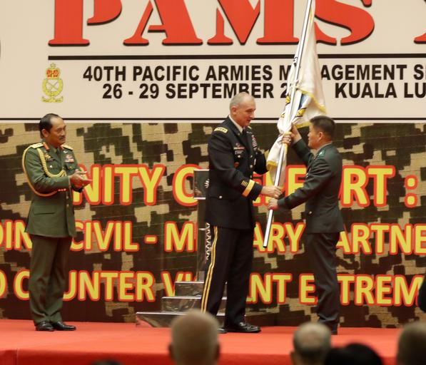 | Keywords: u.s. army pacific usarmypacific pacific armies management seminar pacificarmiesmanagementseminar #usarpac usarpac #pacom pacom pams xl pamsxl lt. gen. dato’ sri zulkiple ltgendato’srizulkiple gen. robert brown genrobertbrown kuala lumpur kualalumpur malaysia theater security theatersecurity minister of defence malaysia ministerofdefencemalaysia dato’ seri hishammuddin dato’serihishammuddin text Center) U.S. Army Pacific Commander, Gen. Robert B. Brown, passes the Pacific Armies Management Seminar flag to (right) Brigade Commander, 13th Special Force Brigade, Brig. Gen. Dong Jin Geon while Field Commander West, Malaysian Army, Lt. Gen. Dato’ Sri Zulkiple observes. Geon represents the Republic of Korea, the 2017 host of Pacific Armies Chiefs Conference and Pacific Armies Management Seminar. Leaders from 30 of 34 Armies across the Indo-Asia-Pacific gathered in Kuala Lumpur, Malaysia from Sept. 26 – 29 for the 40th PAMS co-hosted by the Malaysian Army and USARPAC. PAMS is the largest theater security and cooperation event co-hosted by USARPAC in terms of country participation and the role of co-host rotates to a different partner nation annually. The long-term objective of PAMS is to promote peace and stability in the Indo-Asia-Pacific region through mutual understanding, dialogue, and friendship.(Photo by Russell K. Dodson/Released) Center) U.S. Army Pacific Commander, Gen. Robert B. Brown, passes the Pacific Armies Management Seminar flag to (right) Brigade Commander, 13th Special Force Brigade, Brig. Gen. Dong Jin Geon while Field Commander West, Malaysian Army, Lt. Gen. Dato’ Sri Zulkiple observes. Geon represents the Republic of Korea, the 2017 host of Pacific Armies Chiefs Conference and Pacific Armies Management Seminar. Leaders from 30 of 34 Armies across the Indo-Asia-Pacific gathered in Kuala Lumpur, Malaysia from Sept. 26 – 29 for the 40th PAMS co-hosted by the Malaysian Army and USARPAC. PAMS is the largest theater security and cooperation event co-hosted by USARPAC in terms of country participation and the role of co-host rotates to a different partner nation annually. The long-term objective of PAMS is to promote peace and stability in the Indo-Asia-Pacific region through mutual understanding, dialogue, and friendship.(Photo by Russell K. Dodson/Released) |