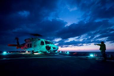 | Keywords: usn 161104-N-UF697-206 WATERS EAST OF JAPAN (Nov. 4, 2016) Petty Officer 3rd Class Xavier N. Woods directs an SH-60K Sea Hawk helicopter from the Japan Maritime Self-Defense Force (JMSDF) on the flight deck of the forward-deployed Arleigh Burke-class guided-missile destroyer USS Barry (DDG 52) during Keen Sword 17 (KS17). KS17 is a biennial, Chairman of the Joint Chiefs of Staff-directed, U.S. Pacific Command-sponsored Field Training Exercise (FTX). KS17 is a joint/bilateral FTX designed to meet mutual defense objectives by increasing combat readiness and interoperability between Japan Self-Defense Forces (JSDF) and U.S. Forces. Barry is on patrol with Carrier Strike Group Five (CSG 5) in waters east of Japan supporting security and stability in the Indo-Asia-Pacific region. (U.S. Navy photo by Petty Officer 2nd Class Kevin V. Cunningham/Released) 161104-N-UF697-206 WATERS EAST OF JAPAN (Nov. 4, 2016) Petty Officer 3rd Class Xavier N. Woods directs an SH-60K Sea Hawk helicopter from the Japan Maritime Self-Defense Force (JMSDF) on the flight deck of the forward-deployed Arleigh Burke-class guided-missile destroyer USS Barry (DDG 52) during Keen Sword 17 (KS17). KS17 is a biennial, Chairman of the Joint Chiefs of Staff-directed, U.S. Pacific Command-sponsored Field Training Exercise (FTX). KS17 is a joint/bilateral FTX designed to meet mutual defense objectives by increasing combat readiness and interoperability between Japan Self-Defense Forces (JSDF) and U.S. Forces. Barry is on patrol with Carrier Strike Group Five (CSG 5) in waters east of Japan supporting security and stability in the Indo-Asia-Pacific region. (U.S. Navy photo by Petty Officer 2nd Class Kevin V. Cunningham/Released) |