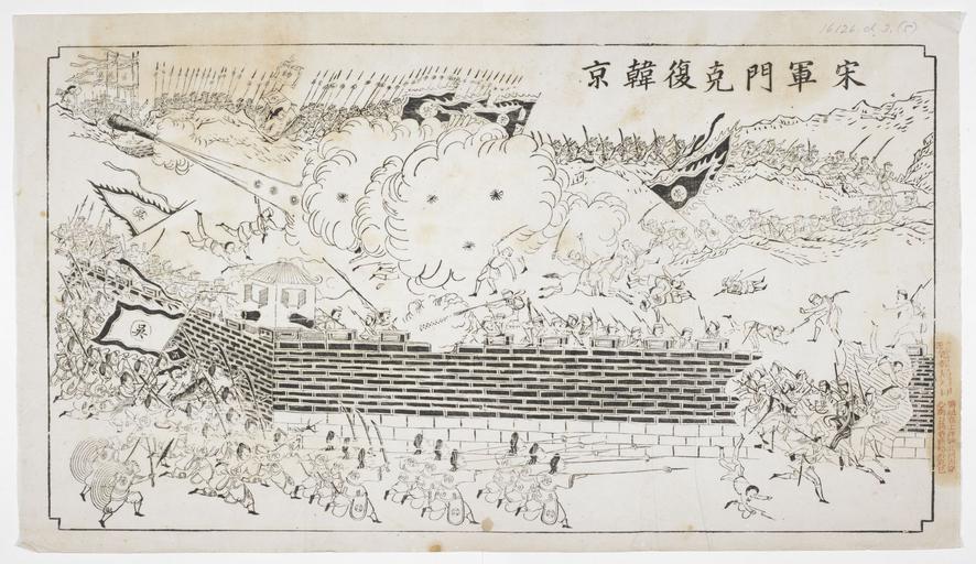 | Keywords: 16126.d.3(5)-General Song Qing conquers the Korean capital.jpg accession number Creator 無し Size cm 64 0 36 8 exhibition history Institution British Library object history object type Information field Title Original Chinese 宋軍 克復韓京 ; Information field Title Pinyin Song jun men ke fu Han jing ; Information field Title Japanese Translation 宋(慶)提 が 鮮の都を奪還する ; Information field Publisher 表記無し Unknown ; Information field British Library Shelfmark 16126 d 3 5 PD-old-auto place of creation China place of discovery cite web The Sino-Japanese War of 1894-1895 as seen in prints and archives http //www jacar go jp/english/jacarbl-fsjwar-e/gallery/gallery006 html Japan Centre for Asian Historical Records and the British Library British Library image 16126 d 3 5 BLL01016132528 yes General Song Qing conquers the Korean capital Uploaded with GWToolset 16126 d 3 5 -General Song Qing conquers the Korean capital http //www jacar go jp/jacarbl-fsjwar-j/gallery/images/zoom/16126 d 3/16126 d 3_ 5 _B20106-77 jpg British Library Asian and African Collections Prints of the First Sino-Japanese War in the British Library |