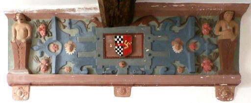 Keywords: 1615 Overmantel HawkridgeBarton Chittlehampton Devon.PNG en 1615 plaster strapwork overmantel in the Inner Room next to the Great Hall in Hawkridge Barton Chittlehampton Devon showing the arms of Acland Chequy argent and sable a fesse gules impaling Tremayne Gules three dexter arms conjoined at the shoulders and flexed in triangle or the fists clenched argent representing the 1615 marriage of Baldwin II Acland 1593-1659 and Elizabeth Tremayne It consists of a strapwork cartouche with small heads probably of Cain and Abel to each side flanked by foliage and figures of Adam and Eve with the serpent above Listed building text own photo Lobsterthermidor <span class signature-talk ></span> 17 49 6 May 2015 UTC photo 2014 Overmantels Acland arms Tremayne arms Hawkridge Chittlehampton Strapwork |