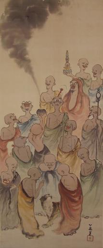 Keywords: 16 Arhats.aka.Luohans.a.k.a.Juroku Rakan.wittig.collection.detail.edited.working.print.01..jpg en Painting of the 16 Arhats/Arhants/Luohans a k a Juroku Rakan; they are depicted with various associated symbolic items; done in a gentle caricature style; late 19th to early 20th century Japanese Signed sealed artist not yet identified Each arhat is probably intended to be individually identifiable through their actions associated objects For example the red-hooded figure in the top right quadrant is Bodhidarma/Daruma Edited version cropped intended as a working print for use in wikipedia articles etc 2011-04-17 photo by original uploader original artist not yet identified an image set of this painting is pending help is needed in identifying/translating the artist's markings signature seal help is needed in identifying each of the 16 figures as a specific individual arhat out of the designated 16 this is a working print intended for use in wikipedia articles etc please feel free to upload an improved version PD-Art-100 Uploaded with UploadWizard 16 Arhats Paintings from Japan Paintings on scrolls from Japan |