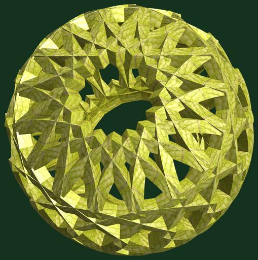 Keywords: mathematica 3d cg parametricplot3d texture torus code program algorithm プログラム コード アルゴリズム 輪環 りんかん ドーナツ どーなつ 五芒星 ごぼうせい geometric sculpture geometricsculpture shape geometry sculpture mapping テクスチャ マッピング 模様 もよう abstract 抽象 ちゅうしょう アブストラクト design pattern デザイン パターン graphic グラフィック グラフィクス structure 意匠 構造 symmetry 対称性 たいしょうせい シンメトリー 対称 たいしょう foliage plant leaf black background outdoor organic pattern a = 10; (* center hole size *) b = 5; (* penta-torus *) c = -16; (* distance from the center of rotation *) d = 16; (* number of torus *) h = 2; (* height of a torus *) SetOptions[ParametricPlot3D, PlotRange -> Full, Mesh -> None, Boxed -> False, Axes -> False, PlotPoints -> 250, ImageSize -> 2400, Background -> RGBColor[{20, 50, 30}/255], PlotStyle -> Directive[Specularity[White, 30], Texture[Import["D:/tmp/71.jpg"]]], TextureCoordinateFunction -> ({#4, #5 Pi} &), Lighting -> "Neutral"]; f[v_] := TriangleWave[{-1, 1}, v/(2 Pi)]; g[v_] := TriangleWave[{-1, 1}, v/(2 Pi) + 1/4]; x = (a - g[t] - f[b s]) Cos[s + 3 Pi/(4 b)]; y = (a - g[t] - f[b s]) Sin[s + 3 Pi/(4 b)]; z = (a - f[t] - h f[b s]) + c; rm = Table[{x, y, z}.RotationMatrix[2 i Pi/d, {1, 1, 0}], {i, d}]; ParametricPlot3D[rm, {t, 0, 2 Pi}, {s, 0, Pi}] (*--- The Texture *) a = 10; (* center hole size *) b = 5; (* penta-torus *) c = -16; (* distance from the center of rotation *) d = 16; (* number of torus *) h = 2; (* height of a torus *) SetOptions[ParametricPlot3D, PlotRange -> Full, Mesh -> None, Boxed -> False, Axes -> False, PlotPoints -> 250, ImageSize -> 2400, Background -> RGBColor[{20, 50, 30}/255], PlotStyle -> Directive[Specularity[White, 30], Texture[Import["D:/tmp/71.jpg"]]], TextureCoordinateFunction -> ({#4, #5 Pi} &), Lighting -> "Neutral"]; f[v_] := TriangleWave[{-1, 1}, v/(2 Pi)]; g[v_] := TriangleWave[{-1, 1}, v/(2 Pi) + 1/4]; x = (a - g[t] - f[b s]) Cos[s + 3 Pi/(4 b)]; y = (a - g[t] - f[b s]) Sin[s + 3 Pi/(4 b)]; z = (a - f[t] - h f[b s]) + c; rm = Table[{x, y, z}.RotationMatrix[2 i Pi/d, {1, 1, 0}], {i, d}]; ParametricPlot3D[rm, {t, 0, 2 Pi}, {s, 0, Pi}] (*--- The Texture *) |