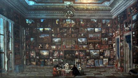 | Keywords: 1702 Bretschneider Gemaeldegalerie anagoria.JPG Artwork Creator Johann Michael Bretschneider en Picture Gallery Oil on canvas The precursors of museums were private galleries of the nobility The painted gallery as a pictorial type arose in the early 17th c This late example depicts an imaginary collection As customary in the 18th c the close hanging and symmetric arrangement of the works follow decorative principles The entire thematic repertoire of painting is presented in a triumphant display Painting can represent everything and thus surpasses all other genres in the arts The foreground figures are engaged in a scholarly discussion on art de Gemäldegalerie Vorläufer der Museen waren fürstliche Galerien Im frühen 17 Jh entstand der Typus des Galeriebildes Das späte Beispiel von Bretschneider zeigt eine fiktive Sammlung Wie im 18 Jh üblich folgt die dichte Hängung und symmetrische Anordnung der Werke dekorativen Prinzipien In einer triumphalen Schau wird der umfassende Themenkanon der Malerei präsentiert Sie vermag alles darzustellen und übertrifft damit die anderen Kunstgattungen Die Figuren im Vordergrund sind in ein gelehrtes Kunstgespräch vertieft anagoria 1702 Institution Germanisches Nationalmuseum PD-old-100 Johann Michael Bretschneider 1700s paintings from Germany Paintings in the Germanisches Nationalmuseum 1702 paintings Baroque paintings in Bavaria 1700s paintings in Bavaria Paintings lacking painting technique information People in rooms in art 17th-century oil on canvas paintings in Germany People with globes in art Museum visitors Paintings of interiors of museums Fictional museums Symmetric paintings Files by User anagoria |