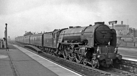 Keywords: blackandwhite monochrome railroad locomotive train vehicle outdoor steam engine black and white Down ECML express passing Finsbury Park Station, 1962. View southward, towards King's Cross and the City; ex-GN London - Peterborough - Doncaster etc. East Coast Main Line. Finsbury Park (with 10 platforms) is the focus of several suburban and connecting lines. The train is on the Down Fast (Platform 5 line) and passing No. 3 Box, which was a Down side Box controlling the Down line from Canonbury (connecting with the North London line and Broad Street) and the exits from Clarence Yard and the Goods & Coal Depot: directly underneath is Seven Sisters Road. The express is the 10.20 King's Cross to Leeds/Bradford/Halifax, headed by A1 Pacific No. 60122 'Curlew'. Down ECML express passing Finsbury Park Station, 1962. View southward, towards King's Cross and the City; ex-GN London - Peterborough - Doncaster etc. East Coast Main Line. Finsbury Park (with 10 platforms) is the focus of several suburban and connecting lines. The train is on the Down Fast (Platform 5 line) and passing No. 3 Box, which was a Down side Box controlling the Down line from Canonbury (connecting with the North London line and Broad Street) and the exits from Clarence Yard and the Goods & Coal Depot: directly underneath is Seven Sisters Road. The express is the 10.20 King's Cross to Leeds/Bradford/Halifax, headed by A1 Pacific No. 60122 'Curlew'. |