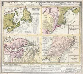 | Keywords: 1737 Homann Heirs Map of New England, Georgia and Carolina, and Virginia and Maryland - Geographicus - DominiaAnglorum-hmhr-1737.jpg A spectacular example of the Homan Heirs 1737 map of the British Territories in North America Divided into four separate maps derived from the work of Herman Moll Covers much of the eastern coast of North America including Nova Scotia Newfoundland New England New York New Jersey Massachusetts Pennsylvania etc Virginia Maryland and Carolina now North Carolina South Carolina Georgia and northern Florida The upper left quadrant features a map of the Maritime Provinces of Newfoundland and Nova Scotia Offers wonderful detail both inland and offshore with special attention to the shoals Upper right hand quadrant features much of New England New York and parts of Pennsylvania and New Jersey The Jerseys are shown spit into eastern and western provinces according to their original charters New York extends northward past Lake Champlain which is itself set significantly south and west of its actual location Notes Albany Lower left quadrant features a map of those parts of Virginia and Maryland adjoining the Chesapeake Bay Lower right quadrant features much of what is today North Carolina South Carolina Georgia Alabama and Northern Florida Notes land dispute with the Spanish territories with regard to the rights to Northern Florida referencing various charters to the Carolinas Predates Georgia Excellent detail both inland and along the coast Bounded on the western end by the Appalachian Mountains Below the map is a large text area with notations on the land and peoples depicted including a special commentary dedicated to the Iroquois Nation circa 1737 undated Size in 21 5 19 5 object history credit line accession number DominiaAnglorum-hmhr-1737 Geographicus-source PD-old-100 Johann Baptist Homann Old maps of the United States 1737 maps Maps in Latin |