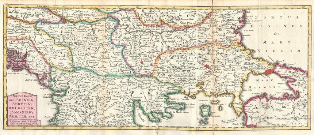 | Keywords: 1738 Ratelband Map of the Balkans ( Bosnia, Serbia, Bulgaria, Rumania ) - Geographicus - Balkans-lafeuille-1738.jpg  This is a rare and unusual 1738 map of the Balkans by J Ratelband Likely revised and updated from earlier charts by the De La Feuille family Depicts from modern day Albania Dalmatia eastward through Bosnia Serbia Bulgaria and Rumania to the Black Sea Pontus Euxinus Extends south as far as modern Greece and includes parts of Asia Minor in the lower right quadrant Prominently labels the cities of Constantinople Istanbul Andrinopoli Belgrade and Sophia Curiously the location of the ancient city of Troy is also labeled with considerable accuracy considering that it was supposedly lost until Heinrich Schliemann discovered it in 1870 Dutch title cartouche in the lower left quadrant This map was originally prepared for inclusion as chart no 1738 Size in 16 25 7 object history credit line accession number Balkans-lafeuille-1738 Geographicus-source PD-old-100 Daniel de La Feuille Balkans Johannes Ratelband 1738 maps Balkans 18th-century maps of the Balkans Maps in Dutch Balkans Sea of Marmara Kingdom of Serbia 1718 “1739 |
