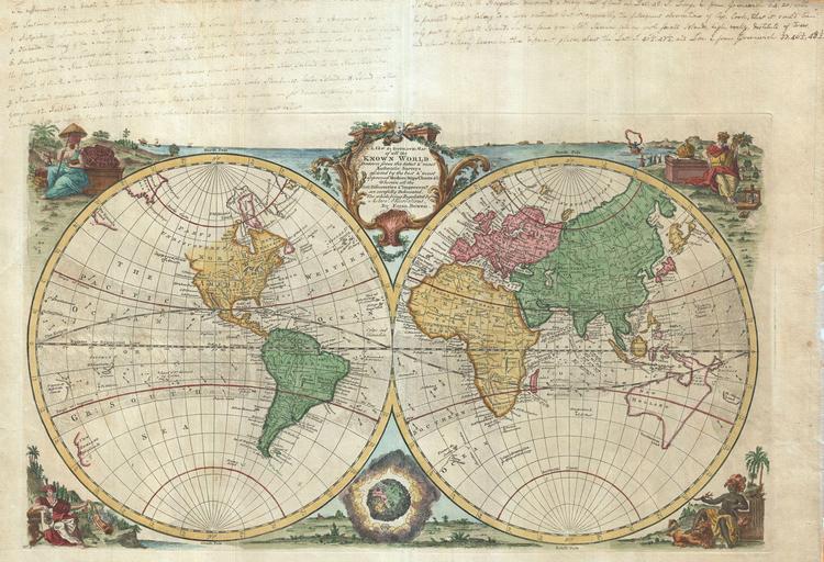 | Keywords: 1744 Bowen Map of the World in Hemispheres - Geographicus - World-bowen-1744.jpg An extremely attractive 1744 decorative double hemisphere world map by the English cartographer Emmanuel Bowen This beautiful map covers the entire world as it was understood in the middle part of the 18th century before the explorations of Cook Wilkes and others Surrounded by decorative engravings of women representing each of the continents America in the upper left Europe in the upper right Asia in the lower left and Africa in the lower right The decorative baroque title cartouche appears at top center Color coding according to continent Limited inland detail but major cities geographical landmarks and regions are noted In the tropics ocean currents are identified “ a very unusual addition This map is most interesting for its treatment of the western coast of America the Pacific and most importantly Australia Bowen issued this map during a dark period in Australian exploration the seventy-some years between the navigations of William Dampier in 1699 and Tobias Furneaux in 1773 Consequently most of the cartographic information on this map dates to 17th century Dutch expeditions to Australia ™s western coast such as those of Abel Tasman and William Janszoon Consequently we see a very ephemeral speculative mapping of the continent with Van Diemens ™s Land Tasmania and New Guinea attached to the mainland The unexplored eastern coast of the continent is mapped simply as a straight line running from New Guinea directly south to the tip of Tasmania New Zealand appears in a very embryonic form as a single landmass with no western shore This most likely conforms to Abel Tasman ™s 1642 sighting of the western coast of South Island Another curious landmass appearing to the northeast of New Holland or Australia and to the west of New Zealand is labeled H Ghost Land ™ From its geographical situation it may represent New Caledonia though it was not officially discovered until Captain Cook landed there in 1774 Just to the north of New Zealand yet another mysterious landmass appears this one is called Tierra de Espirio Sancto a speculative enlargement and mismapping of the New Hebrides Islands as discovered by the Spanish explorer and religious zealot Pedro Fernandez di Quir or Quiros Quiros believing he had discovered the great southern continent of Terre Australis mapped the islands much larger then they in fact were Another smaller group of islands several hundred miles further east is also labeled after Quiros Secretive self-delusional fanatical and inept Quiros made charts that bordered on fictional It took several hundred years and no less a navigator than James Cook to finally figure out exactly what Quiros actually discovered Though Siberia exhibits considerable detail consistent with Vitus Bering ™s 1728 exploration of the region the opposite side of the Strait in America is less clear Bowen identifies it as the Supposed Strait of Anian and Parts Undiscovered leaving much of the northwestern parts of America blank What he does do however is leave a number of inlets in what is today California that are highly suggestive of possible northwest passages He also labeled Drakes ™ Port the site where Sir Francis Drank supposedly landed restocked and repaired his vessels during his 1579 circumnavigation of the globe Today the true location of Drake ™s Port is a much debated cartographic mystery What we know from Drake is that it is a safe harbor that lies to the north of the furthest Spanish Claim Point Loma along the coast that Drake named New Albion Some have associated Drake ™s Harbor with San Francisco Bay Bodega Bay or San Pablo Bay but since the relevant records were lost in the 1698 burning of London ™s Whitehall Palace we may never know Also of interest is Bowen ™s mapping of De Gama ™s Land just to the south of Siberia 1744 undated Size in 21 5 12 object history credit line accession number of all the countries islands etc of the known world The whole illustrated with seventy maps all new-drawn and ingraved by Emanuel Bowen brought down to the present time; preserving all that is useful in the fourth and last edition of the Complete Geographer publish'd under the name of Herman Moll c </i> 1744 edition Geographicus-source PD-Art-100 Maps by Emanuel Bowen 1744 maps 1740s maps of the world Old maps of Earth's hemispheres Maps in English Double hemisphere world maps Global maps centered 20W |