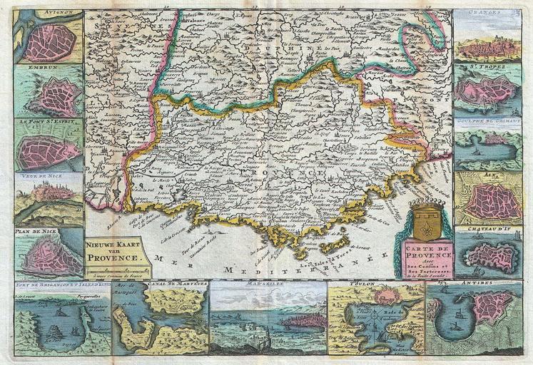 | Keywords: 1747 La Feuille Map of Provence, France - Geographicus - Provence-ratelband-1747.jpg A stunning map of Provence Provençal France first drawn by Daniel de la Feuille in 1706 Flanked on either side by views and plans of important Provençal cities These are from top left Avignon Embrun Le Pont St Esprit Veue de Nice Plan de Nice Fort de Brigancon et Isles D ™Yeres Canal de Marteus Marseille Toulon Antibes Chateau D ™If Aix Goulphe de Grimaut St Tropez and Orange Title in Dutch in lower left quadrant Title in French surmounted by the crowned armorial crest of Provence appears in the lower right quadrant This is Paul de la Feuille ™s 1747 reissue of his father Daniel ™s 1706 map Prepared for issue as plate no 28 in J Ratelband ™s 1747 Geographisch-Toneel 1747 undated Size in 10 25 7 object history credit line accession number Provence-ratelband-1747 <i>Geographisch-Toneel Of uitgezochte Kaarten Tot gemak der Officieren Reisigers en Liefhebbers; Behelsende alle de generale Kaarten </i> 1747 J Ratelband issue Geographicus-source PD-old-100 Old maps of Provence 1747 1747 maps France Daniel de La Feuille France Maps in French France |