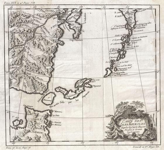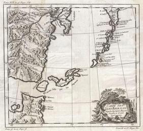 Keywords: 1750 Bellin Map of the Kuril Islands - Geographicus - Kouriles-bellin-1750.jpg A beautiful example of Bellin's c 1750 map of the Kuril Islands The Kuril Islands or Kurile Islands are a volcanic archipelago that stretches approximately 1 300 km 810 mi northeast from Hokkaido Japan to Kamchatka Russia separating the Sea of Okhotsk from the North Pacific Ocean Traditionally the Kuriles are part of Japan however have been under Russian control since World War II Today there is an ongoing dispute between Japan and Russia over which country has jurisdiction over the southernmost four islands in the Kuril archipelago Cartographically this map is based on a larger map of Russia composed by Laurent several years previous Prepared by J Bellin for Abbe Provost's L`Histoire Generale des Voyages ~ 1750 Size in 11 10 object history credit line accession number Kouriles-bellin-1750 Provost A <i>L`Histoire Generale des Voyages</i> c 1750 Geographicus-source PD-old-100 1750 maps Old maps of the Russian Empire Maps of Kuril Islands Maps in French Maps by Jacques-Nicolas Bellin French language maps of the Pacific Ocean |