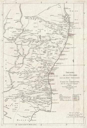 | Keywords: 1759 La Rouge Map of Eastern India or Coromandel (Madras and Pondicherry) - Geographicus - IndiaEast-lerouge-1759.jpg This is an attractive 1759 map of Eastern India or Coromandel by George-Louis le Rouge Covers the Indian coast from Marawa in the south northward past Pondicherry and Madras as far as Pallikata on the Bay of Bengal Extends inland as far as Mashur Offers wonderful inland detail of both roads and river systems Designed to illustrate the then raging struggle by the various colonial powers to control the rich Indian trade Ports are underlined and color coded to signify the colonial empire that controlled them French possessions including Pondicherry are in green Denmark is dark green England is red Holland is yellow and Portugal gray Prepared for issue as plate 151 in Le Rouge ™s Atlas General 1759 dated Size in 13 25 20 object history credit line accession number IndiaEast-lerouge-1759 <i>Atlas General Contenant le Detail Des Quartre Parties Du Monde principalement Celui de l'Europe</i> Compiled atlas 1742-1762 Geographicus-source PD-Art-100 1759 maps of India Old maps of Tamil Nadu French language maps of Asia Maps by Georges Louis Le Rouge |
