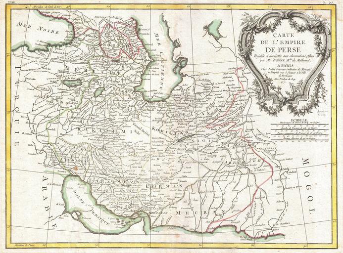 Keywords: 1771 Bonne Map of Persia ( Iran, Iraq, Afghanistan ) - Geographicus - Persia-bonne-1771.jpg Artwork en A beautiful example of Rigobert Bonne's 1771 decorative map of the Persia Covers from the Black Sea south to the Persian Gulf and east past the Caspian Sa to the Indus Valley Includes the modern day nations of Iran Iraq Kuwait Afghanistan Georgia Armenia Azerbaijan with parts of adjacent Turkey Saudi Arabia and Pakistan Names numerous tribal areas villages cities deserts caravan routes and river systems A large decorative title cartouche bearing garlands appears in the upper right hand quadrant A fine map of the region Drawn by R Bonne in 1771 for issue as plate no B 25 in Jean Lattre's 1776 issue of the Atlas Moderne Paris / 1771 dated Size in 17 5 12 75 accession number Persia-bonne-1771 object history credit line Lattre Jean <i>Atlas Moderne ou Collection de Cartes sur Toutes les Parties du Globe Terrestre</i> c 1775 Geographicus-source PD-old-100 https //www raremaps com/gallery/detail/19249/Carte_De_LEmpire_De_Perse_1771/Bonne html Barry Lawrence Ruderman Antique Maps Inc PD-Art-100 Maps by Rigobert Bonne 1771 maps Old maps of Iran Old maps of Iraq Maps of Kuwait Old maps of Afghanistan 18th-century maps of Georgia Old maps of Armenia 18th-century maps of Azerbaijan Old maps of Turkey Old maps of Saudi Arabia Old maps of Pakistan Old maps of the Caucasus Old maps of the Middle East Old maps of the Caspian Sea Old maps showing the whole Near East Old maps of Shirvan |