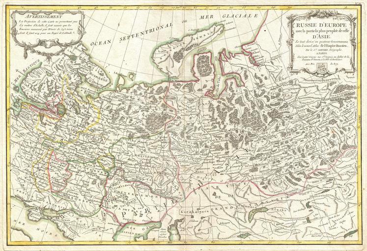 | Keywords: 1775 Janvier Map of Western Russia - Geographicus - RussiaWest-janvier-1775.jpg A beautiful example of Jan Janvier's curious decorative map of Western Russia Covers from Poland and the Baltic Sea eastward as far as Ilimskoy Siberia extends south to the Black Sea and north as far as Nouvelle Zembla and the Arctic Sea Ostensibly focuses on the most inhabited portions of the Russian empire in Europe and Asia Offers excellent detail throughout showing mountains rivers forests national boundaries regional boundaries forts and cities A large decorative title appears in the upper right quadrant Upper left quadrant features an advertisement Drawn by Jan Janvier around 1775 for issue as plate no 22 in Jean Lattre's 1776 issue of the Atlas Moderne 1775 undated Size in 18 12 5 object history credit line accession number RussiaWest-janvier-1775 Lattre Jean <i>Atlas Moderne ou Collection de Cartes sur Toutes les Parties du Globe Terrestre</i> c 1775 Geographicus-source PD-old-100 Maps by Jean Janvier 1775 maps Old maps of the Russian Empire |
