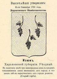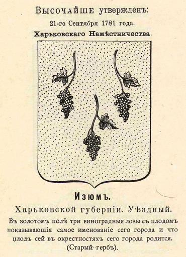 Keywords: Хар губ Изюм 1781 из Винклера.jpg Official Russian Empire coat of arms Izum Т н гласный ге б изюм Российской Импе ии уездного го ода Изюм Ха ьковской губе нии с официальным описанием в Ге бовнике Винкле а П П фон-Винкле Ге бы го одов губе ний областей и посадов Российской Импе ии внесенные в Полное Соб ание законов с 1649 по 1900 год Дозволено цензу ою С -Пете бу г 20 Июля 1899 года Издание книгото говца Ив Ив Иванова С -Пете бу г Типог афия И Комелова П яжка д 3 1899 \ Scanned paper book 1775 Ге бовник Ще батова /1781 утве ждён / 1899 published П П фон Винкле \ Pavel von Vinkler PD-old PD-RusEmpire PD-RU-exempt coats of arms Gerbovnik Vinklera - City CoAs Изюm Coats of arms of Izium 1781 in Kharkov Governorate Russian canting arms