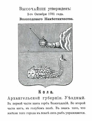 | Keywords: Кола 1781 из Винклера.jpg Official Russian Empire coat of arms Kola Ге б Российской Импе ии уездного го ода Кола А хангельской губе нии в 1781 - Вологодского наместничества с официальным описанием в Ге бовнике Винкле а Изоб ажена ыба кит в п едставлении художника 18 века П П фон-Винкле Ге бы го одов губе ний областей и посадов Российской Импе ии внесенные в Полное Соб ание законов с 1649 по 1900 год Дозволено цензу ою С -Пете бу г 20 Июля 1899 года Издание книгото говца Ив Ив Иванова С -Пете бу г Типог афия И Комелова П яжка д 3 1899 \ Scanned by Vizu 1781 \ 1899 published П П фон Винкле \ Pavel von Vinkler PD-old-70 PD-RusEmpire PD-RU-exempt coats of arms <references/> Gerbovnik Vinklera - City CoAs Coats of arms of Vologda Governorate Coats of arms of Arkhangelsk Governorate Kola |