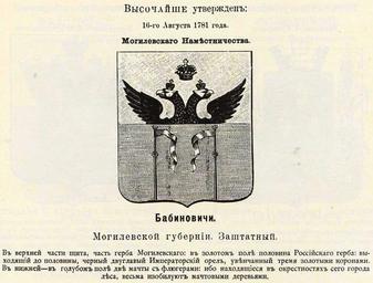 Keywords: Бабиновичи 1781 из Винклера.jpg Official Russian Empire coat of arms Babinovichi Ге б Российской Импе ии заштатного го ода Бабиновичи огилевской губе нии в 1781 - огилёвского наместничества с официальным описанием в Ге бовнике Винкле а П П фон-Винкле Ге бы го одов губе ний областей и посадов Российской Импе ии внесенные в Полное Соб ание законов с 1649 по 1900 год Дозволено цензу ою С -Пете бу г 20 Июля 1899 года Издание книгото говца Ив Ив Иванова С -Пете бу г Типог афия И Комелова П яжка д 3 1899 \ Scanned 1781 \ 1899 published П П фон Винкле \ Pavel von Vinkler PD-old PD-RusEmpire PD-RU-exempt flags Gerbovnik Vinklera - City CoAs Coats of arms of Mahilioŭ Governorate Eagles in heraldry Flags in heraldry