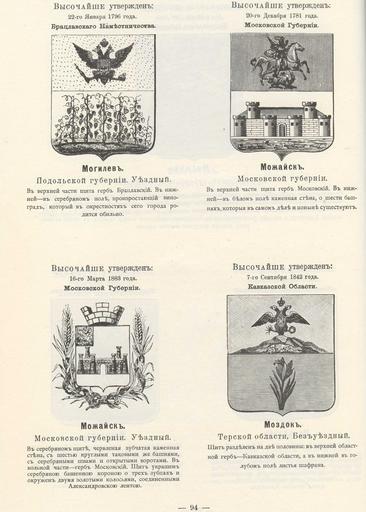 | Keywords: Могилев Можайск 1781 1883 Моздок из Винклера.jpg Official Russian Empire coats of arms Ге бы го одов Российской Импе ии огилев Подольский ожайск оздок с официальными описаниями в Ге бовнике Винкле а П П фон-Винкле Ге бы го одов губе ний областей и посадов Российской Импе ии внесенные в Полное Соб ание законов с 1649 по 1900 год Дозволено цензу ою С -Пете бу г 20 Июля 1899 года Издание книгото говца Ив Ив Иванова С -Пете бу г Типог афия И Комелова П яжка д 3 1899 \ Scanned by Vizu 1899 published П П фон Винкле \ Pavel von Vinkler PD-old PD-RusEmpire PD-RU-exempt coats of arms Gerbovnik Vinklera - Pages 094 Coats of arms of cities in Podolia Governorate Coats of arms of Mohyliv-Podilskyi Coats of arms of Moscow Governorate Terek Oblast Mozdok |