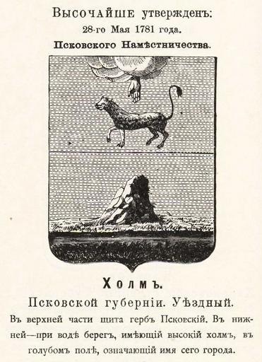 | Keywords: Холм 1781 из Винклера.jpg Official Russian Empire coat of arms Holm Гласный ге б Российской Импе ии уездного го ода Холм Псковской губе нии с официальным описанием в Ге бовнике Винкле а П П фон-Винкле Ге бы го одов губе ний областей и посадов Российской Импе ии внесенные в Полное Соб ание законов с 1649 по 1900 год Дозволено цензу ою С -Пете бу г 20 Июля 1899 года Издание книгото говца Ив Ив Иванова С -Пете бу г Типог афия И Комелова П яжка д 3 1899 \ Scanned 1781 \ 1899 published П П фон Винкле \ Pavel von Vinkler PD-old PD-RusEmpire PD-RU-exempt coats of arms Gerbovnik Vinklera - City CoAs Coats of arms of Pskov Governorate Hills in heraldry Russian canting arms |