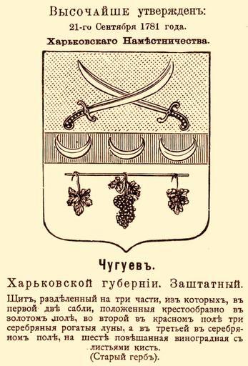 | Keywords: Хар губ Чугуев 1781 из Винклера.jpg Official Russian Empire Chuguev coat of arms Chuguev Ге б Российской Импе ии заштатного го ода Чугуев Ха ьковской губе нии с официальным описанием в Ге бовнике Винкле а П П фон-Винкле Ге бы го одов губе ний областей и посадов Российской Импе ии внесенные в Полное Соб ание законов с 1649 по 1900 год Дозволено цензу ою С -Пете бу г 20 Июля 1899 года Издание книгото говца Ив Ив Иванова С -Пете бу г Типог афия И Комелова П яжка д 3 1899 \ Scanned paper book 1775 Ге бовник Ще батова /1781 утве ждён / 1899 published П П фон Винкле \ Pavel von Vinkler PD-old PD-RusEmpire PD-RU-exempt coats of arms Gerbovnik Vinklera - City CoAs Чугуeв Coats of arms of Chuhuiv 1781 in Kharkov Governorate Swords in heraldry 3 crescents argent in heraldry |